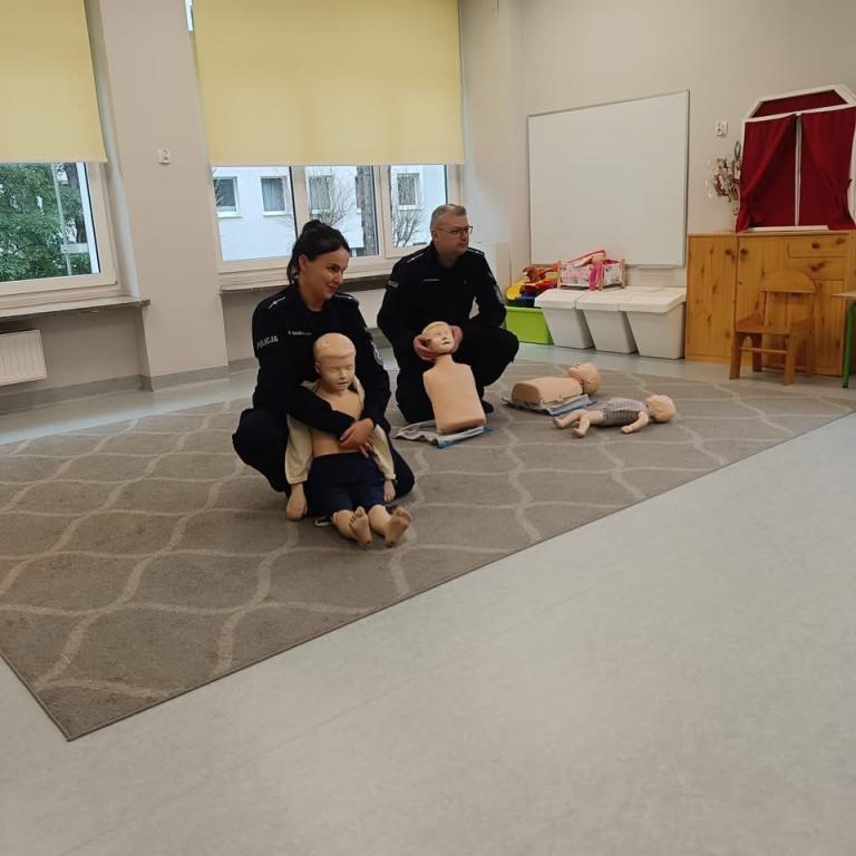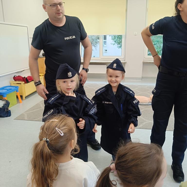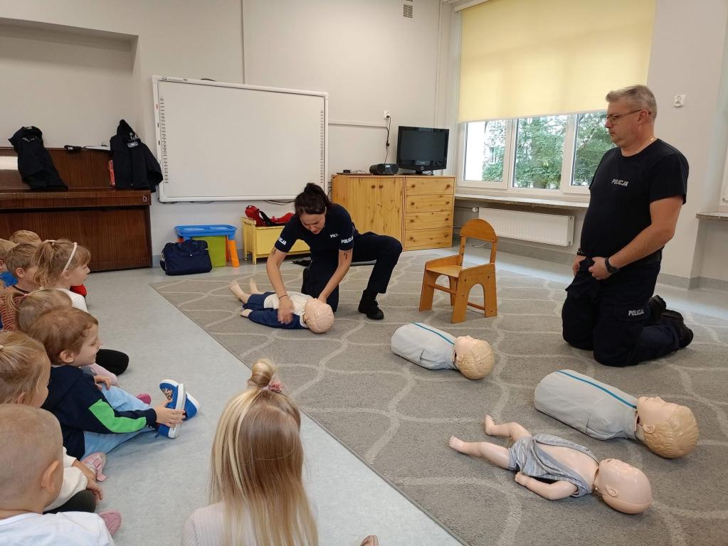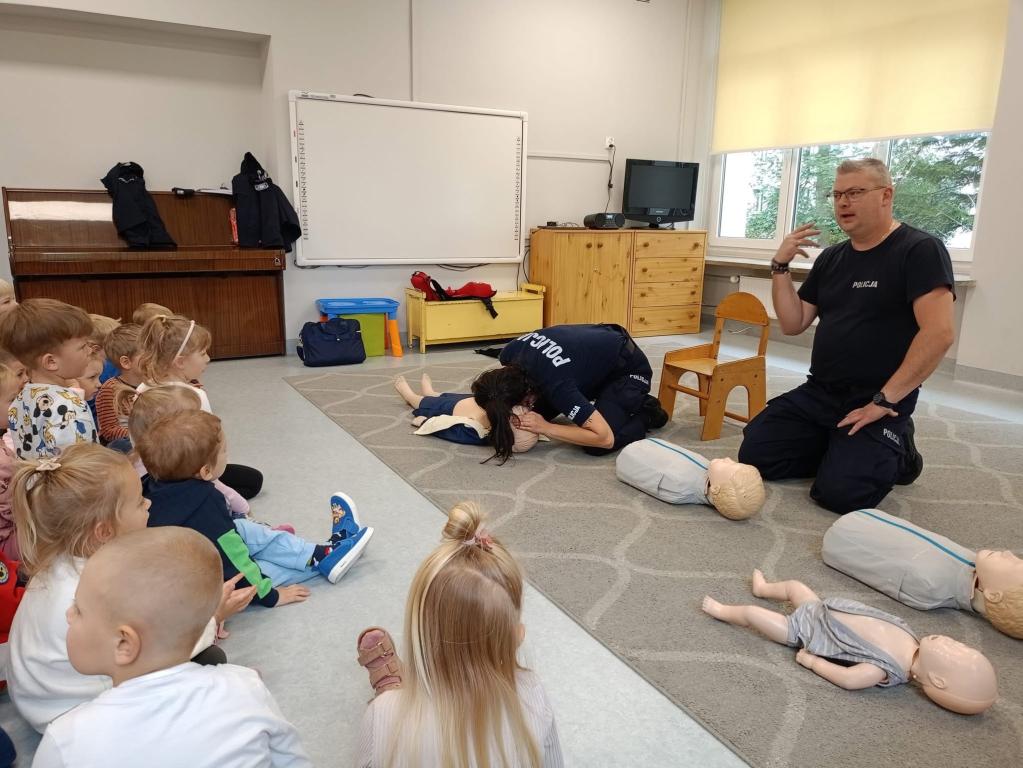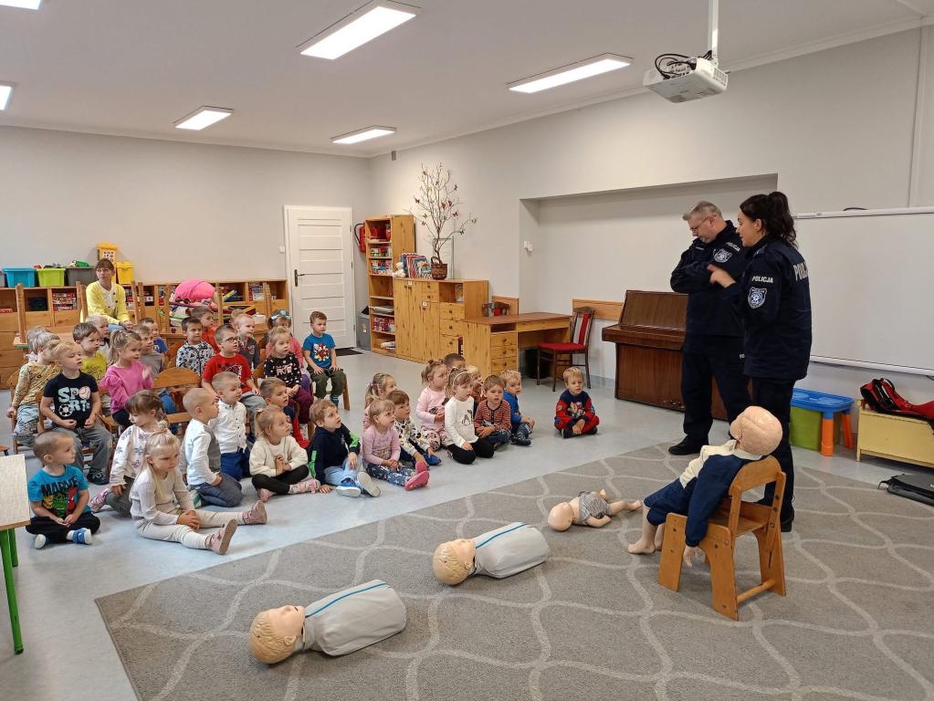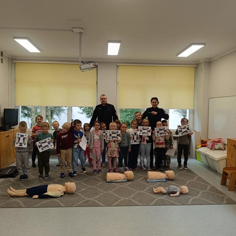Spotkanie dzieci z policjantami- dziękujemy p.Ewie i p.Pawłowi za przypomnienie zasad udzielania pierwszej pomocy przedmedycznej oraz przybliżenie specyfiki pracy policjanta.