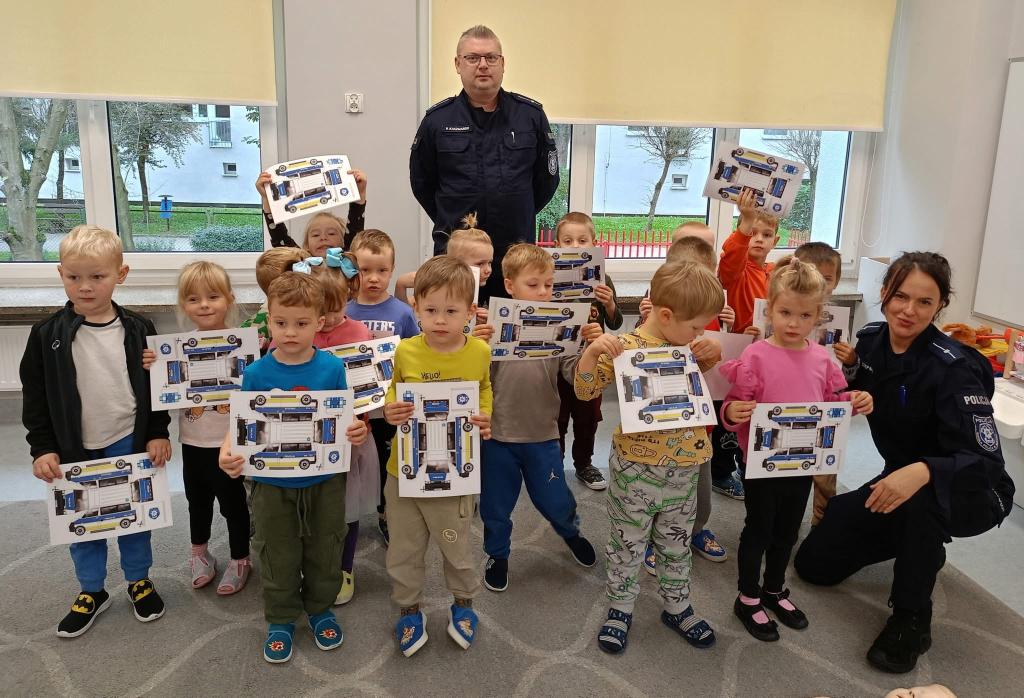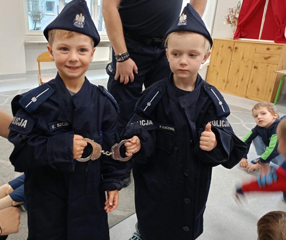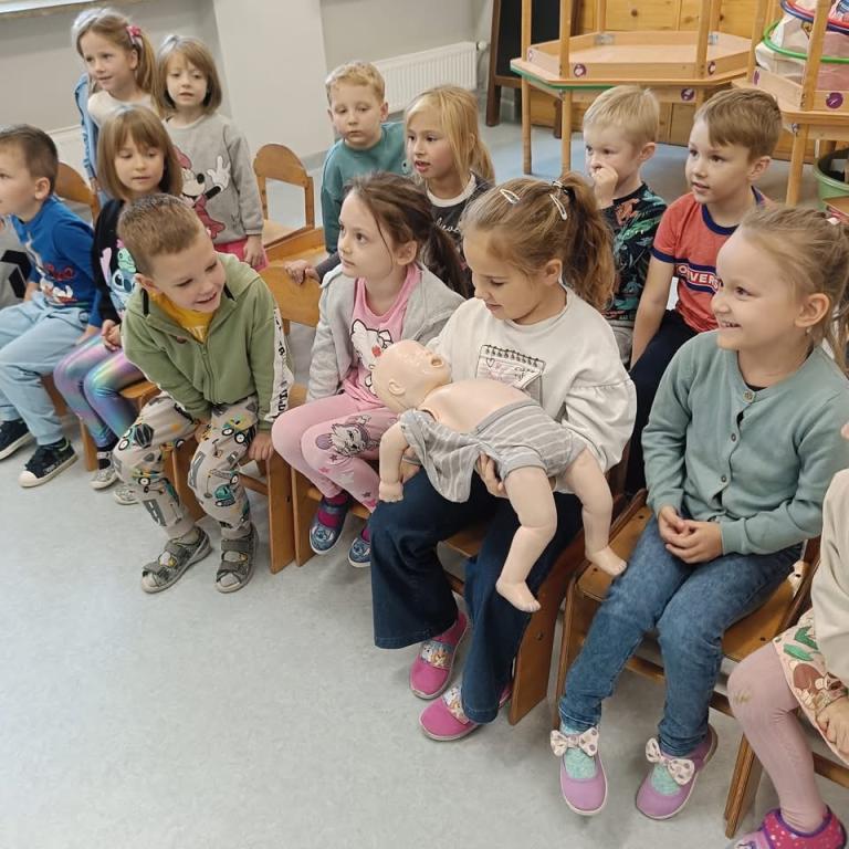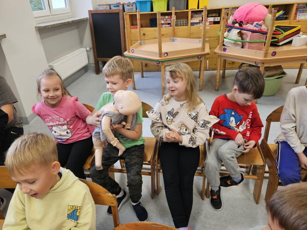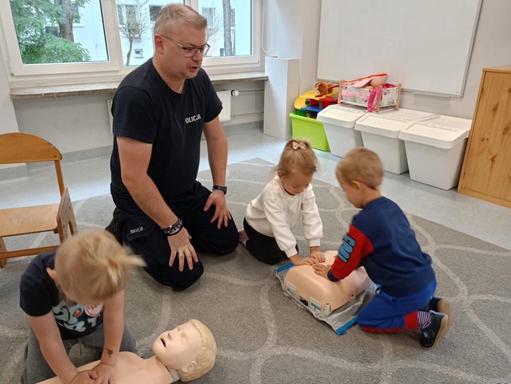 Spotkanie dzieci z policjantami- dziękujemy p.Ewie i p.Pawłowi za przypomnienie zasad udzielania pierwszej pomocy przedmedycznej oraz przybliżenie specyfiki pracy policjanta.