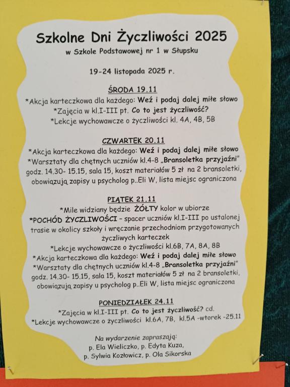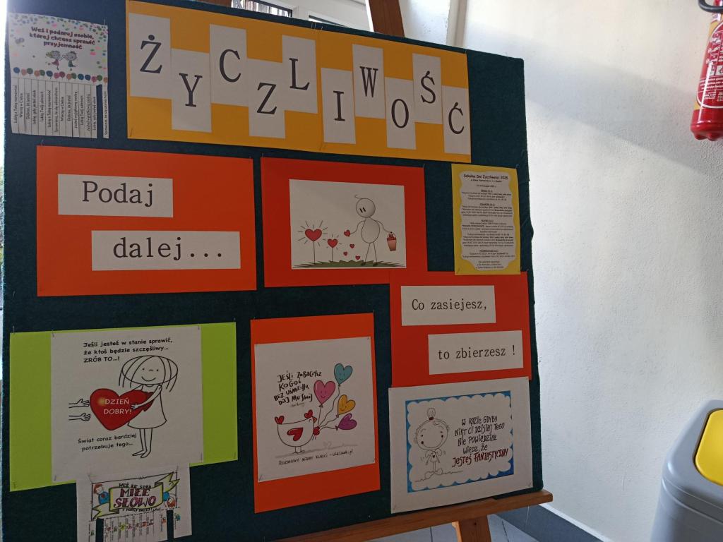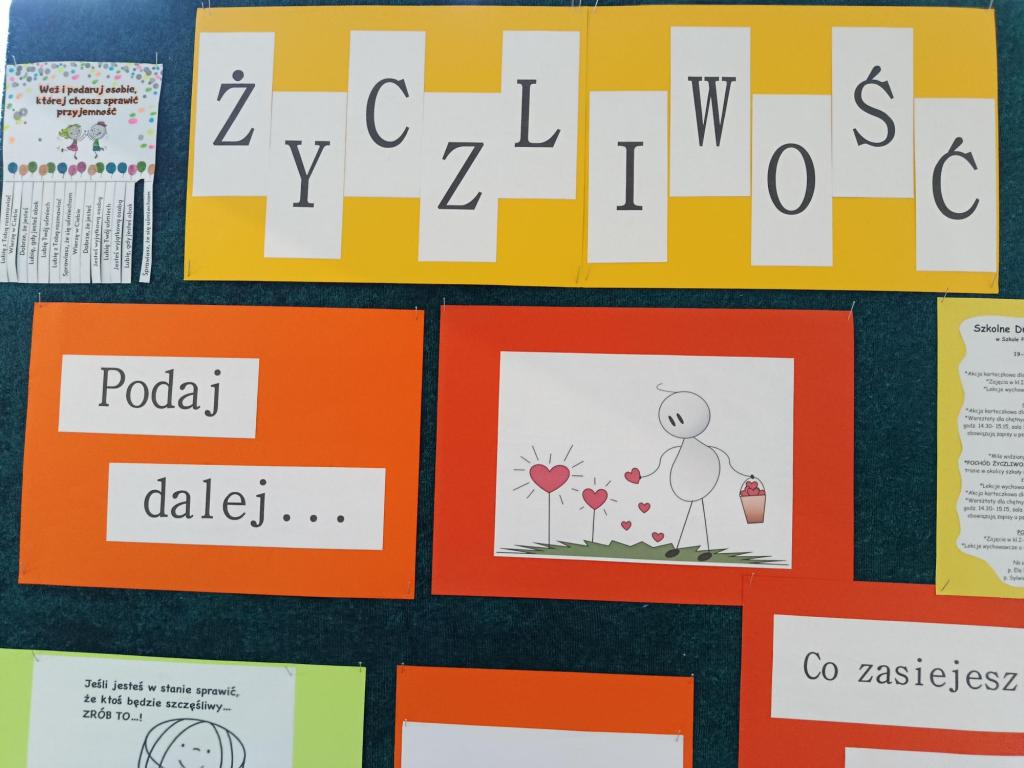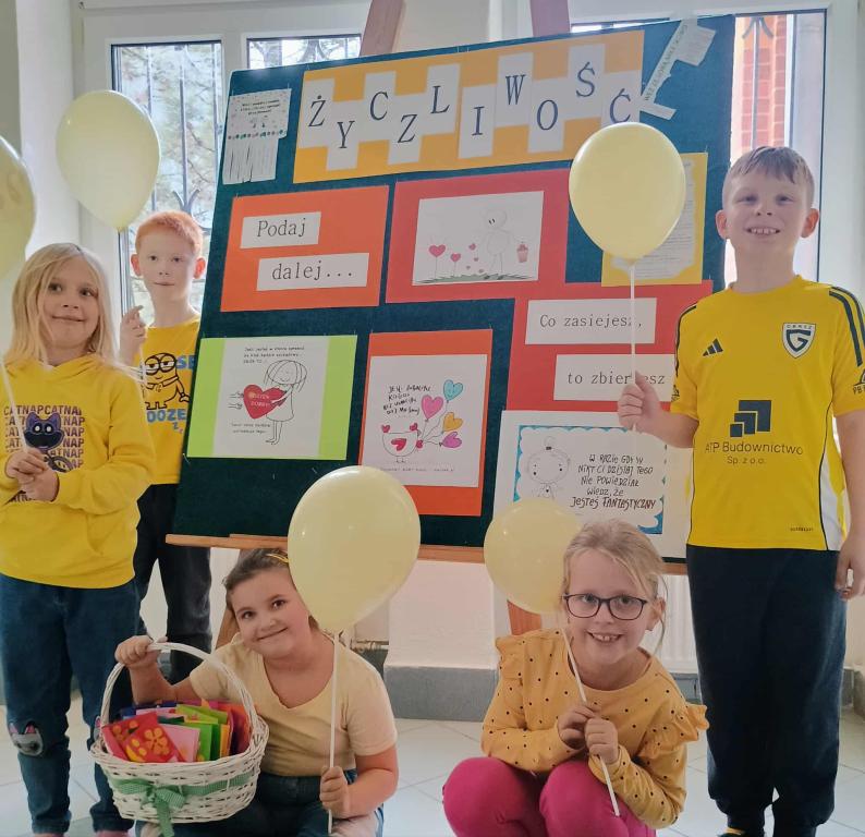 Podczas obchodów tygodnia życzliwości, uczniowie naszej szkoły mieli wiele okazji aby obdarować innych swoją dobrą energię. Odbyło się wiele ciekawych inicjatyw. Dzieci rozdawały karki z miłymi sentencjami pracownikom i nauczycielom szkoły, odbyły się warsztaty z psychologiem szkolnym w klasach I-III oraz w kl. 1a także z pedagogiem szkolnym, na temat życzliwości. Dzieci dzieliły się dobrymi słowami także z okolicznymi mieszkańcami w trakcie marszu po okolicy. Dzieci wykonywały trójwymiarowe, „ruchome” karteczki z postaciami z bajek przygotowanymi przez szkolnych specjalistów. Całość uświetniona została ubiorem i gadżetami w kolorze żółtym w Światowym Dniu Życzliwości w piątek, jak tez licznymi gazetkami szkolnymi. Zaledwie 3 akty życzliwości tygodniowo poprawiają akceptację rówieśniczą i dobrostan, czego dowiedli badacze z Kanady. Według badań „Kindness counts” z 2012 roku zachęcanie dzieci do zachowań prospołecznych zwiększa poziom akceptacji u rówieśników oraz wpływa na dobre samopoczucie. Korzystajmy z tej wiedzy i przekazujmy życzliwość innym każdego dnia.