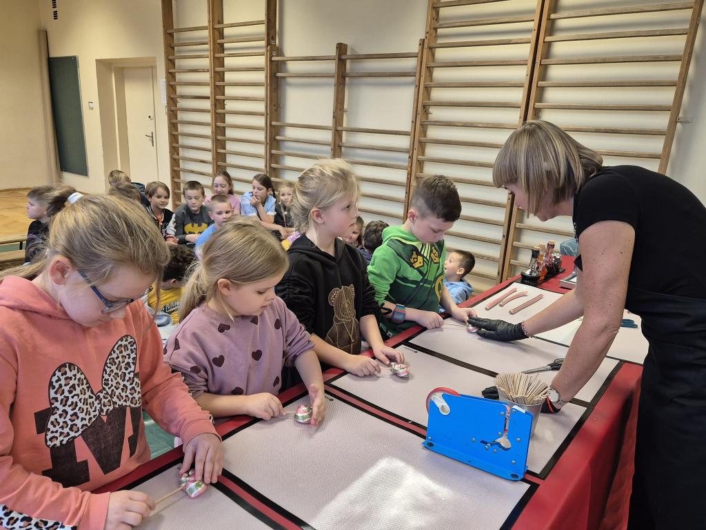 W dniu dzisiejszym klasy 1a,1b,2a i 2b wzięły udział w niecodziennych warsztatach cukierniczych. Spotkanie prowadziła firma Karmelek z Koszalina. Dzieci obserwowały pokaz tworzenia masy cukrowej potrzebnej do wykonania lizaków. Poznały od podstaw cały proces cukierniczy od wylania gorącej masy na tace,przez barwienie,zagniatanie aż do formowania lizaków. Każdy uczeń mógł samodzielnie stworzyć własnego lizaka o smaku arbuzowym. Emocji, radości i słodkiego smaku i aromatu nie brakowało.